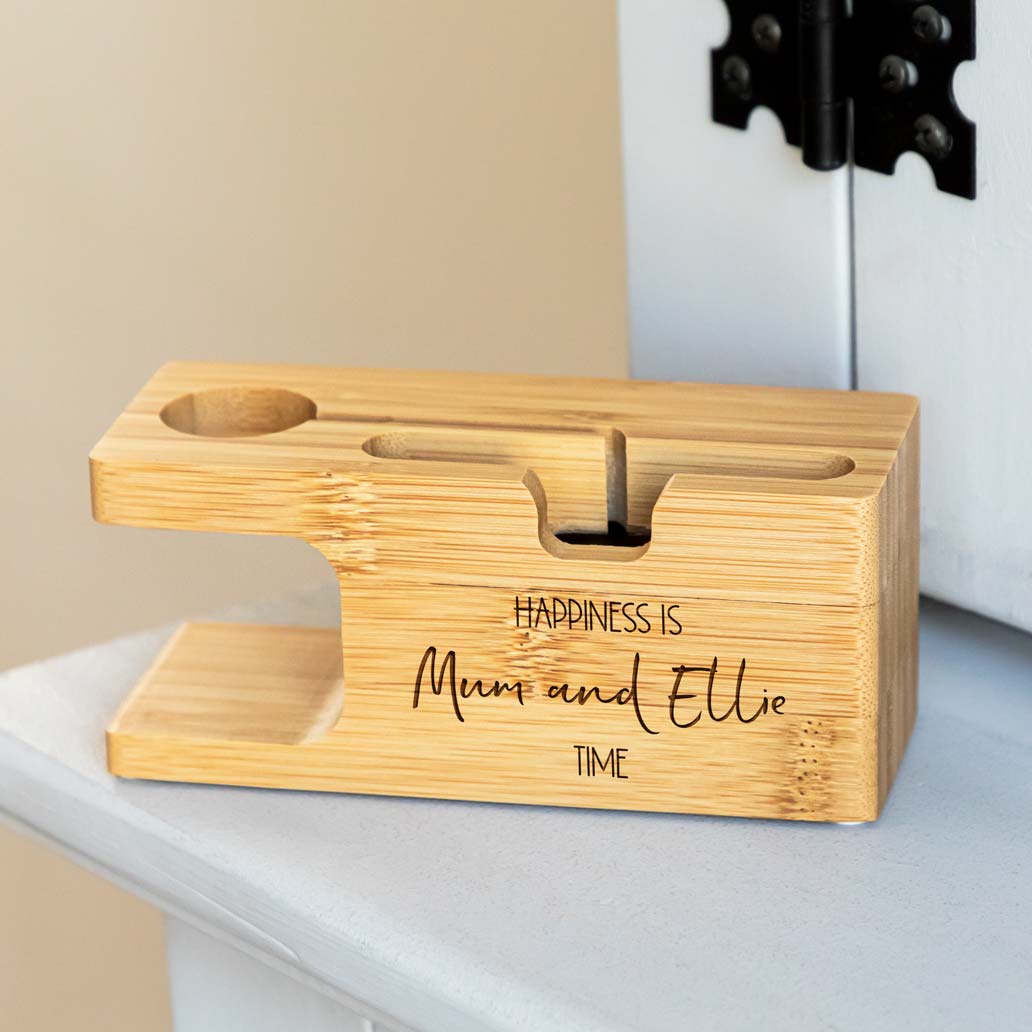The charging station is laser-engraved with "Happiness is name & name time" including the personalised names, making a great personalised tech gift or Mother's Day gift.