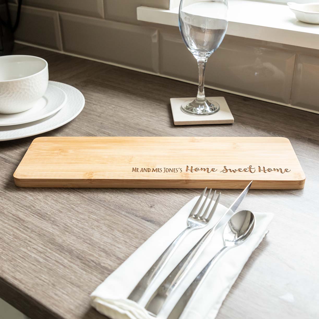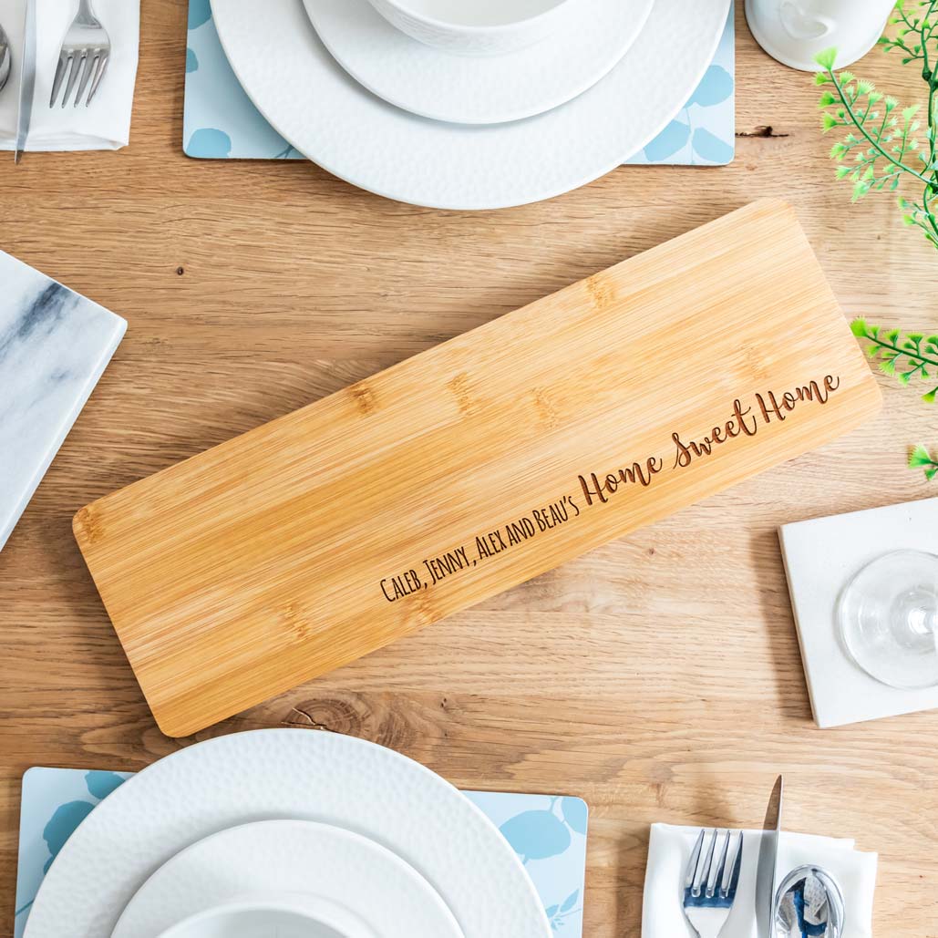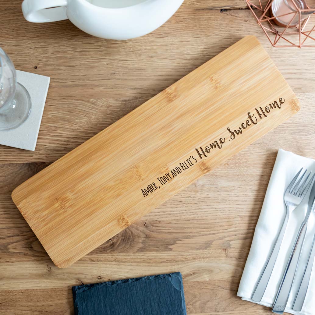 The perfect new home gift for any couple or family, this personalised bamboo serving board is laser-engraved with the personalised name/s.