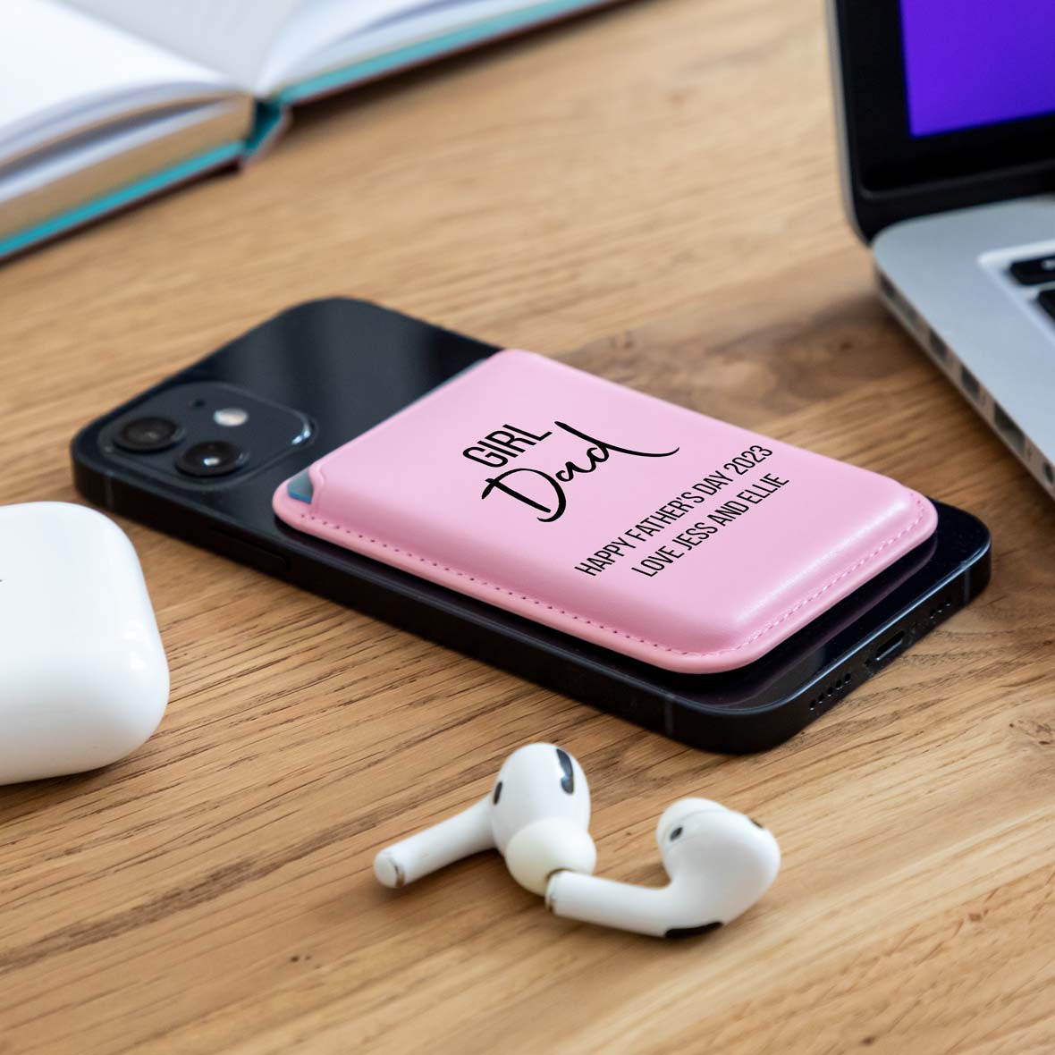 The personalised MagSafe wallet is printed with a single colour design that says "Girl Dad" or "Boy Dad" followed by the personalised message, making a great personalised tech gift or Father's Day gift.