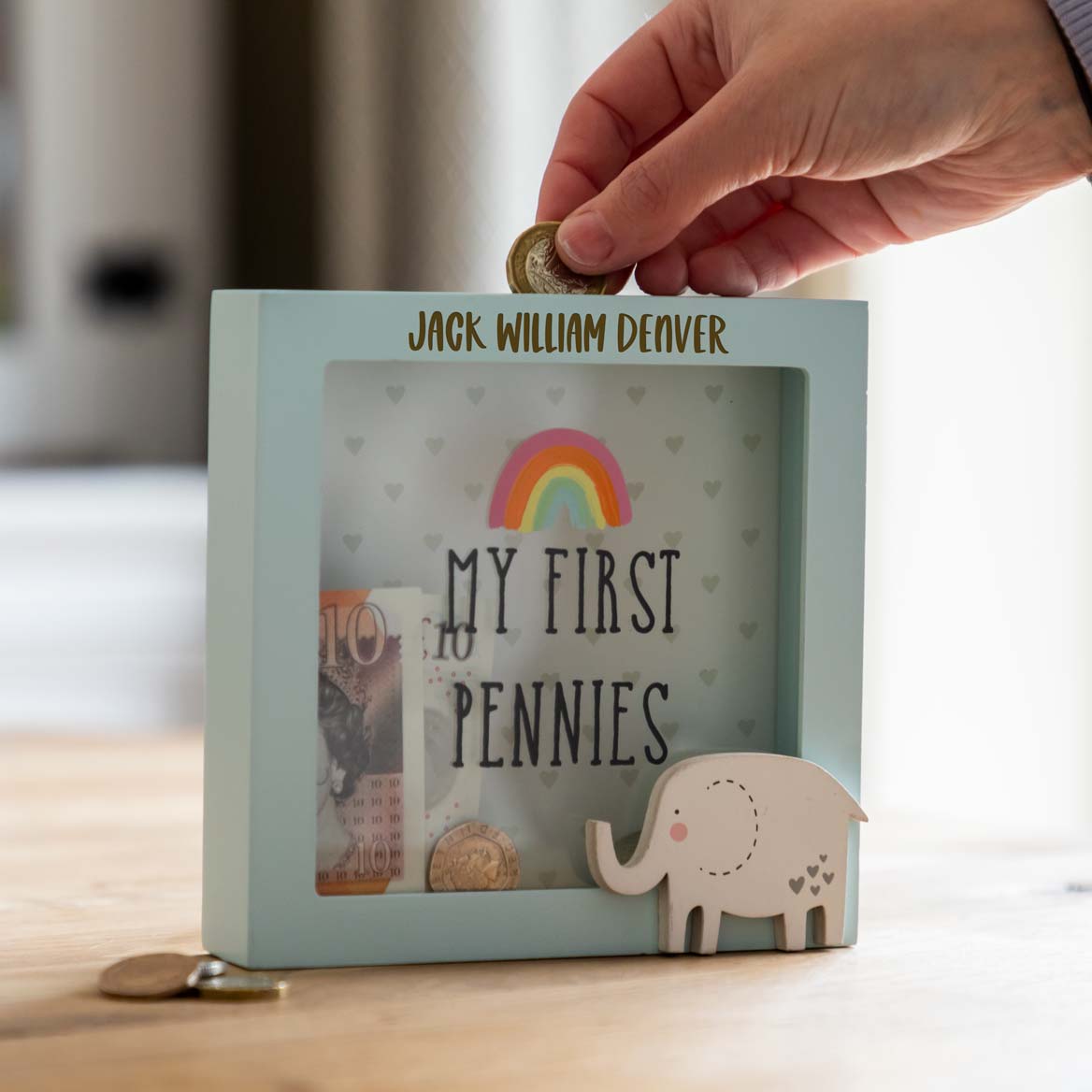 Personalise the wooden money box with any name. Please provide the required text in the personalisation field/s, entering it exactly as you would like it to appear on the product e.g. "Jack William Denver".