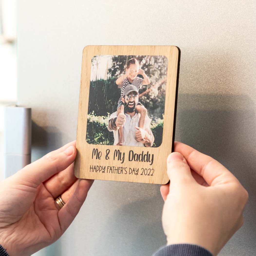Personalised the photo magnet with any text. Please provide the required text in the personalisation field/s, entering it exactly as you would like it to appear on the product e.g. "Me & My Daddy" and "Happy Father's Day 2022".