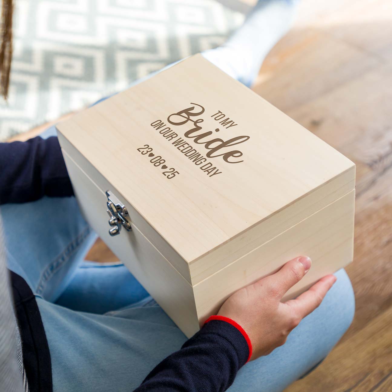 The wooden keepsake box is engraved with "To my Bride / Groom on our Wedding Day" followed by the personalised wedding date with hearts.