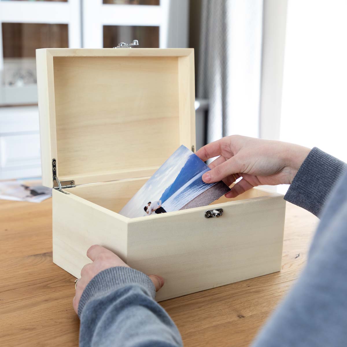 This wedding keepsake box is made from solid wood. As this is a 100% bare, natural wood product, slight differences may occur in the grain of the wood. The design is printed directly onto the wood in full colour, for a high quality, durable finish.